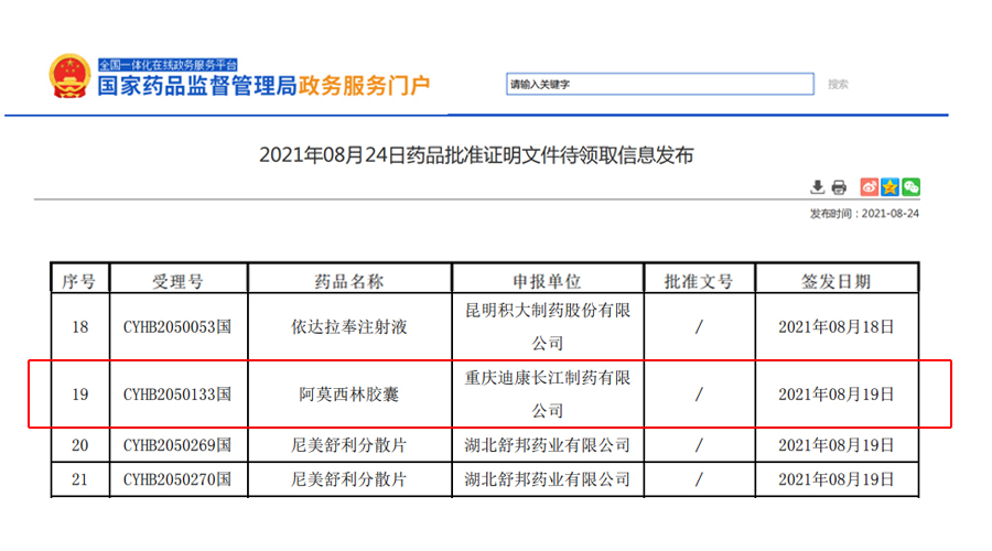 2021年8月19日,國(guó)家藥品監(jiān)督管理局正式發(fā)布通知,重慶迪康長(zhǎng)江制藥有限公司申報(bào)的阿莫西林膠囊正式通過仿制藥質(zhì)量和療效一致性評(píng)價(jià)。